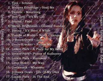 1. Schism - Tool 2. Heal Me - Melissa Etheridge 3. Mourning - Tantric 4. It's My Life - Bon Jovi 5. Fade - Staind 6. Gloomy Sunday - Sarah Brightman 7. It's Been A While - Staind 8. Never Change - Puddle of Mudd 9. Loser - 3 Doors Down 10. Follow Me - Uncle Kracker 11. A Place For My Head - Linkin Park 12. Points of Authority - Linkin Park 13. Runaway - Linkin Park 14. My Way - Limp Bizkit 15. Whatever - Godsmack 16. Life Of My Own - 3 Doors Down 17. In The End - Linkin Park |